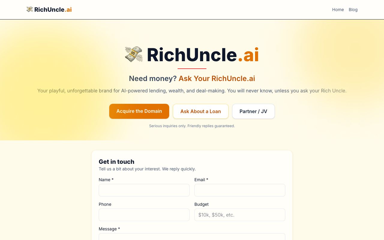 Complete the form below to inquire about pricing, partnership, or acquisition details for richuncle.ai.
