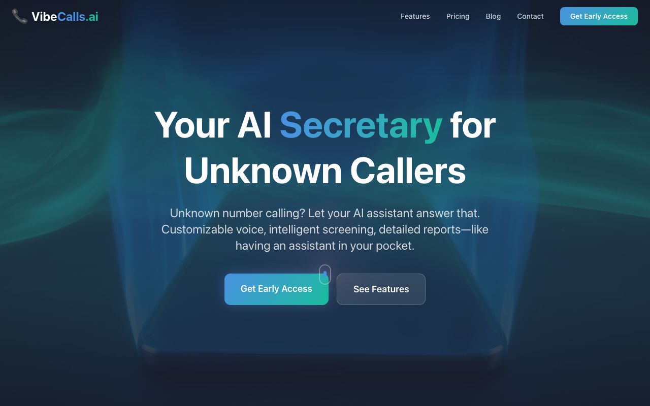 vibecalls.ai becomes your personal AI secretary for phone calls — automatically answering unknown numbers with a customizable voice assistant that screens callers, detects robocalls and AI-generated voices, enforces Do Not Call violations with FTC auto-reporting, and delivers detailed call summaries. It transforms how busy professionals handle phone interruptions, turning missed calls into actionable intelligence.